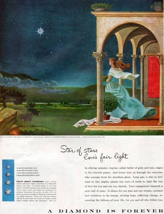 然后,在那樣大蕭條的背景下, 美國的鉆石銷量逆勢上漲55%。 在這樣兇狠的營銷背景下, 20年后, 整整一代人都相信若要結(jié)婚, 鉆戒必不可少。到了1947年,那句廣告語 "A Diamond is forever" (鉆石恒久遠(yuǎn),一顆永留傳)誕生。